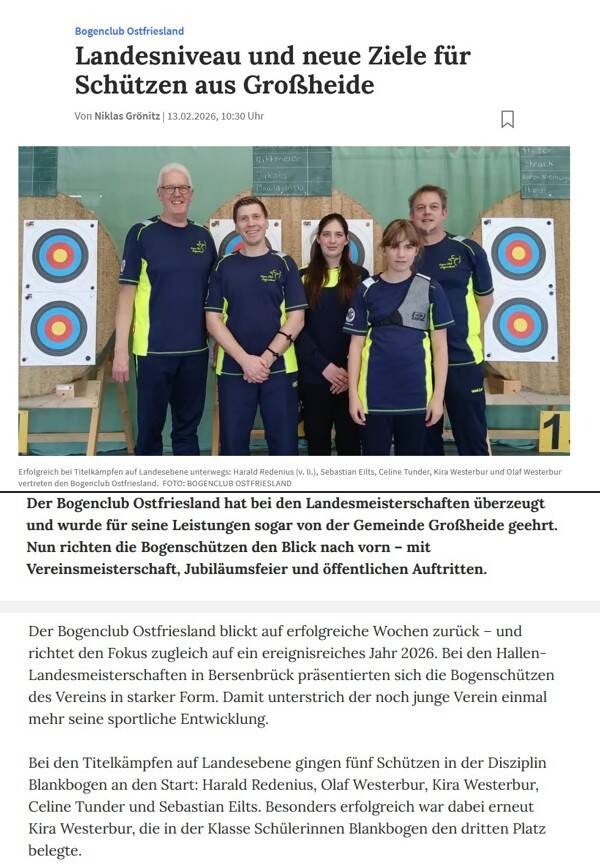 Bersenbrück – Am 17. Januar 2026 fand in Bersenbrück die Landesmeisterschaft im Bogenschießen statt. Mit dabei waren auch fünf Schützinnen und Schützen des BogenClub Ostfriesland, die in der Disziplin Blankbogen an den Start gingen. Für den Verein traten Harald Redenius, Olaf Westerbur, Kira Westerbur, Celine Tunder und Sebastian Eilts an.